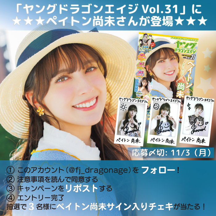 ドラゴンエイジ編集部公式 X(旧:Twitter)アカウントをフォロー&キャンペーンポストをリポスト(RP)していただいた方の中から、抽選で3名様に、ペイトン尚美さんの直筆サイン入りチェキをプレゼントいたします。