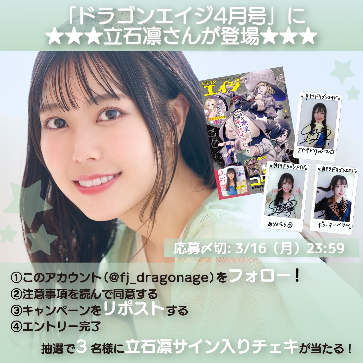 ドラゴンエイジ編集部公式 X(旧:Twitter)アカウントをフォロー&キャンペーンポストをリポスト(RP)していただいた方の中から、抽選で3名様に、立石凛さんの直筆サイン入りチェキをプレゼントいたします。